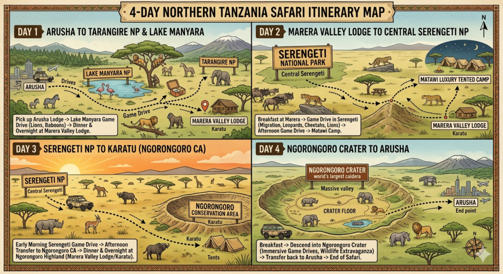 Join Incredible Tanzania Adventures Safaris for a four-day safari trip, where you’ll enjoy luxury and see amazing wildlife. Explore Africa’s beautiful landscapes and watch wild animals in their natural homes. Our Arusha-based tour company makes sure your trip goes smoothly. You’ll get all meals included, a personal English-speaking guide, and a 4×4 Jeep with useful things like water, power sockets, and binoculars, just for you. Experience the magic of Tanzania on this 4-days midrange adventure that blends wildlife, stunning landscapes and local culture. Explore the elephant-rich Tarangire, the legendary Serengeti, and the spectacular Ngorongoro Crater. Conclude your journey with a refreshing visit to Materuni Waterfalls and a guided local coffee tour in the lush foothills of Mt. Kilimanjaro. Designed for travelers who want a balanced mix of safari and culture with midrange comfort and private guiding throughout.
