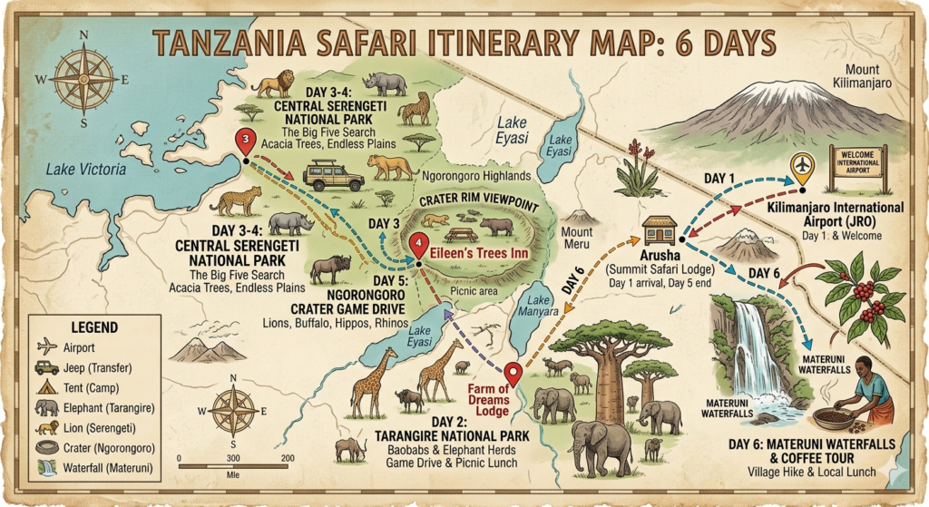 - Arusha ➝ Tarangire ➝ Serengeti ➝ Ngorongoro ➝ Materuni Waterfalls